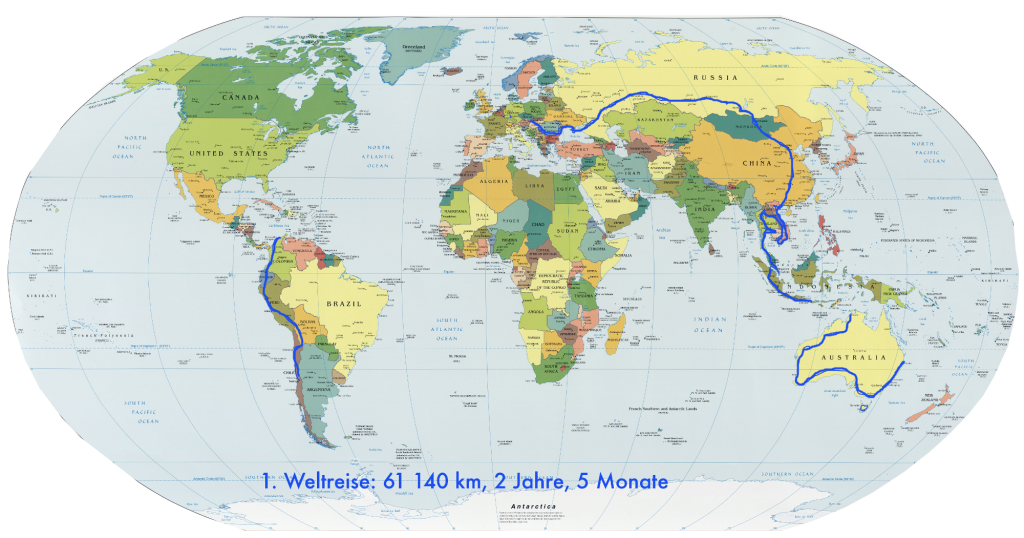 Um die Unterschiede der beiden Routen darzustellen, hier auch nochmals die Route der ersten Weltreise. Die Schnittpunkte waren an den schönsten Orten: Guilin in China, Coolangatta in Australien und Santiago in Chile. Ich war zwei Jahre, drei Monate und eine Woche unterwegs und bin 48.028 Kilometer gefahren. Insgesamt hatte ich sehr wenige Platten und keine nennenswerte Unfälle.